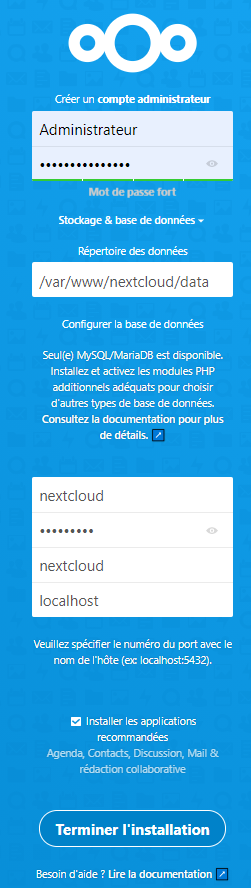Configuration de la base de donnée nextcloud