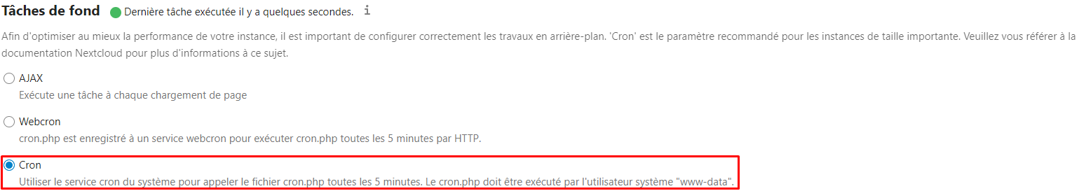 Dans les paramètre de NextCloud sélectionnez Cron en tant que gestionnaire des tâches de fond