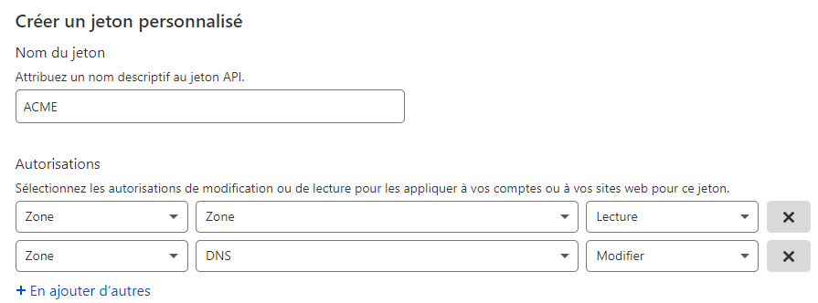 Sur son compte cloudflare créer le jeton avec les autorisations suivantes: