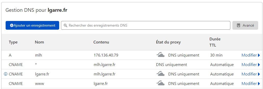 - Un enregistrement A (IPv4) mlh pointant sur une IPv4 publique